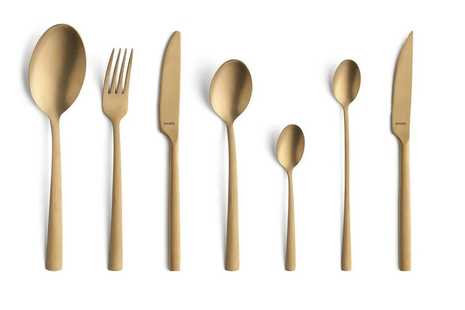 Affirmez votre style avec le set de couverts 42 pièces Amefa Manille All You Need. Des couverts au look brut, doré mat. Les couverts Manille d’Amefa ont un manche plat et un look élégant et moderne. Ils sont faits en acier inoxydable 18/0 avec un revêtement fin en titane PVD (Physical Vapor Deposition).