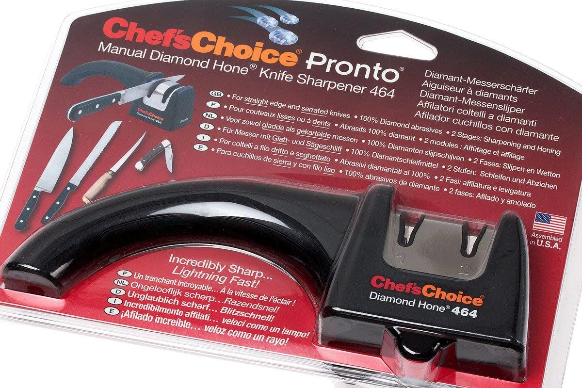 Le Chef’s Choice ProntoPro 464 est un aiguiseur de couteaux compact et efficace. Cet aiguiseur fonctionne à l’aide de meules diamantées. On obtient ainsi un bon polissage facilement et très vite. Grâce à la technologie criss-cross, votre couteau se retrouve sans ébarbures et sa lame devient très tranchante. Vous coupez donc de façon optimale et sans effort. Il est doté d’un confortable manche et d’un pied anti-dérapant pour une utilisation optimale. ## Fonctionnement du Chef’s Choice Pronto 464