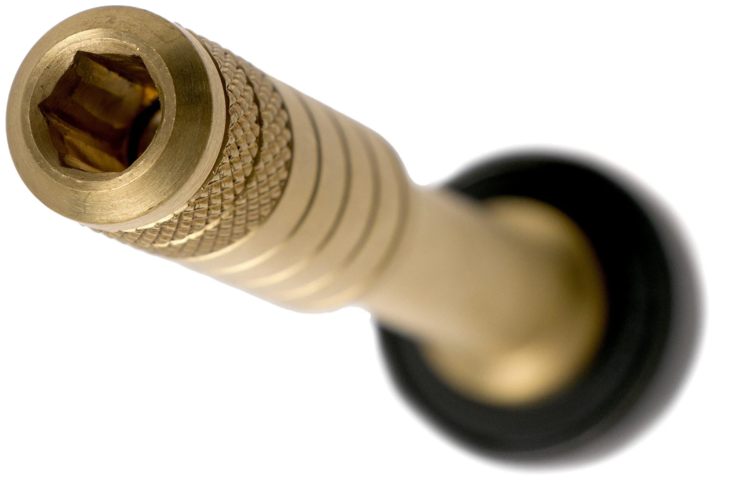 Le CRKT Hex Bit Driver est un porte-embout robuste, conçu par Scout Tools. Il est en laiton robuste avec un roulement à billes à l’extrémité, pour une manipulation plus précise. On tient cette partie dans la paume de la main pour plus de stabilité, et vos doigts contrôlent la vis. Ce modèle a une connexion d’embouts de 6,35mm (1/4″).