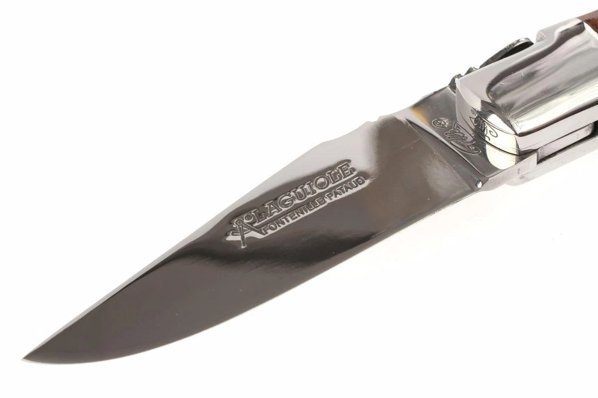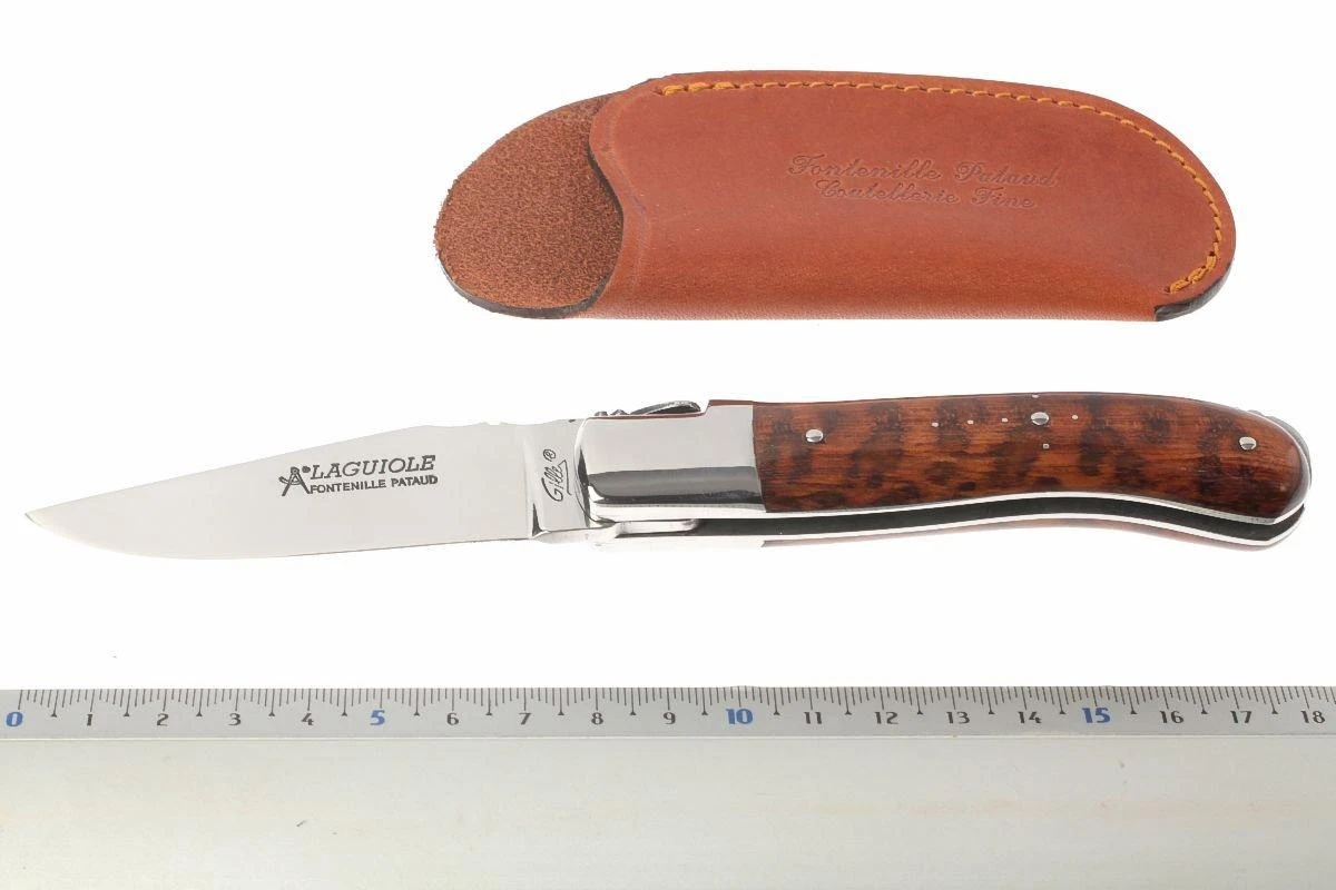 Handgefertigtes, original französisches Laguiole-Sportmesser. Länge im geschlossenen Zustand: 10,5 cm. Klinge aus 14C28N-Stahl und Griffschalen aus Schlangenholz Amourette.