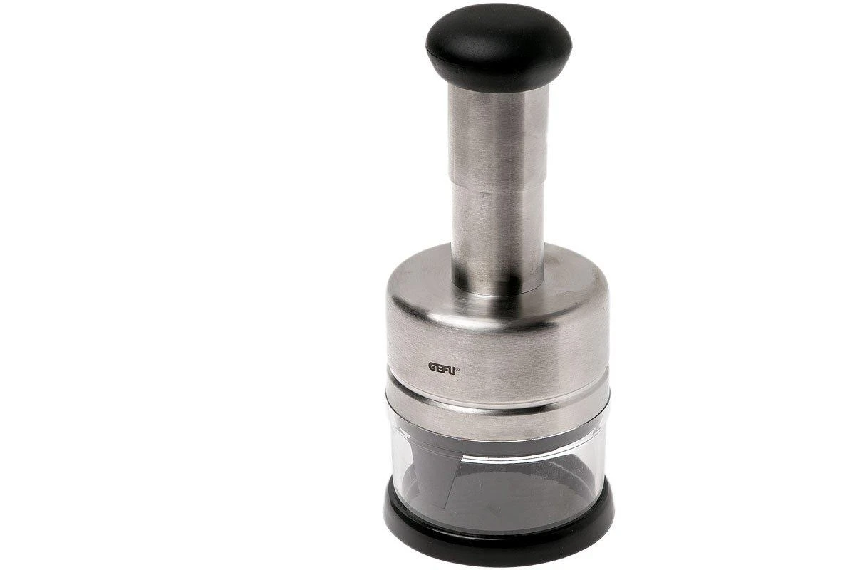 Le hachoir à légumes et à viande GEFU permet de couper des oignons, de l’ail, des noix et des herbes super facilement. Le tout, sans vous salir les mains. Cet ustensile coupe aisément les légumes et herbes en petits morceaux. Il est doté de lames en acier inoxydable. Placez les ingrédients (morceaux grossiers) dans le hachoir. Appuyez sur le bouton, les lames vont tourner. Plus on appuie, plus on va hacher finement. Un racloir tourne dans le bol doseur et empêche l’accumulation de restes dans le fond. Ainsi, les aliments sont hachés harmonieusement. Enlevez le bol doseur en un tour de main. Le couvercle inclus permet de fermer le petit bac. La contenance du bol doseur est de 250 ml. Tous les éléments peuvent être lavés au lave-vaisselle.