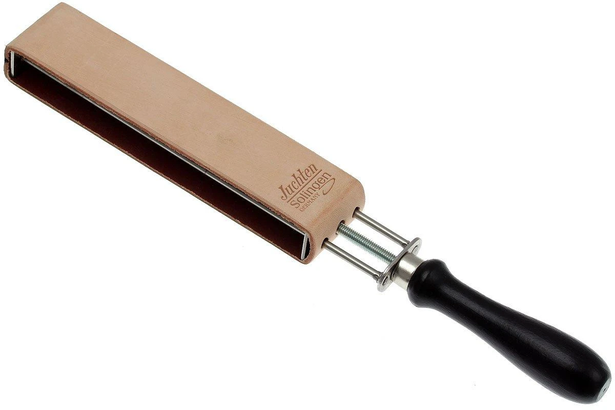 Le cuir à rasoir Herold Solingen recto-verso, sera parfait pour vos lames en acier inoxydable. Vous pourrez facilement resserrer ou desserrer la tension du cuir à l’aide de son système de serrage. Un côté est en cuir naturel, tandis que l’autre est revêtu d’une pâte verte qui sera utile lors du polissage de votre lame. Cet outil est fait en cuir de Russie.