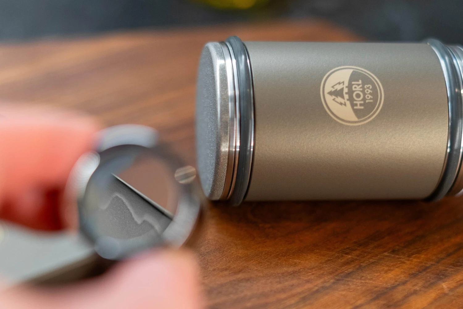 La loupe Horl Lupe a été conçue pour pouvoir contrôler et admirer le tranchant de votre lame. Cette loupe est fabriquée dans la Forêt Noire et offre un grossissement de 3,5 x. C’est idéal pour pouvoir regarder de près l’émouture de votre couteau. Pour ceux qui aiment voir les moindres détails. Cela vous permet de voir le morfil, les petites irrégularités et rayures, et tous les petits défauts qui font que votre lame est émoussée. Étudiez le résultat de votre aiguisage pour l’améliorer et obtenir un tranchant optimal !