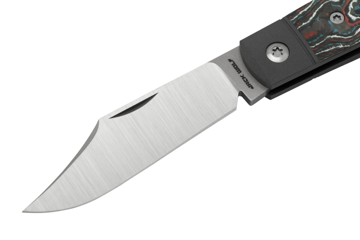 Avec le Jack Wolf Knives Big Bro Fat Carbon Nebula, Benjamin Belkin de Jack Wolf Knives sort un nouveau modèle au superbe design et à la finition soignée. Le motif Sleeveboard, choisi pour ce modèle, tient son nom d’une planche à repasser. Une ancienne version d’une petite planche à repasser, faite spécialement pour repasser des vêtements faits de petites surfaces, telles que des manches, des jambes de pantalon, des liens et des vêtements d’enfant. Le Big Bro est le grand frère du Jack Wolf Little Bro.