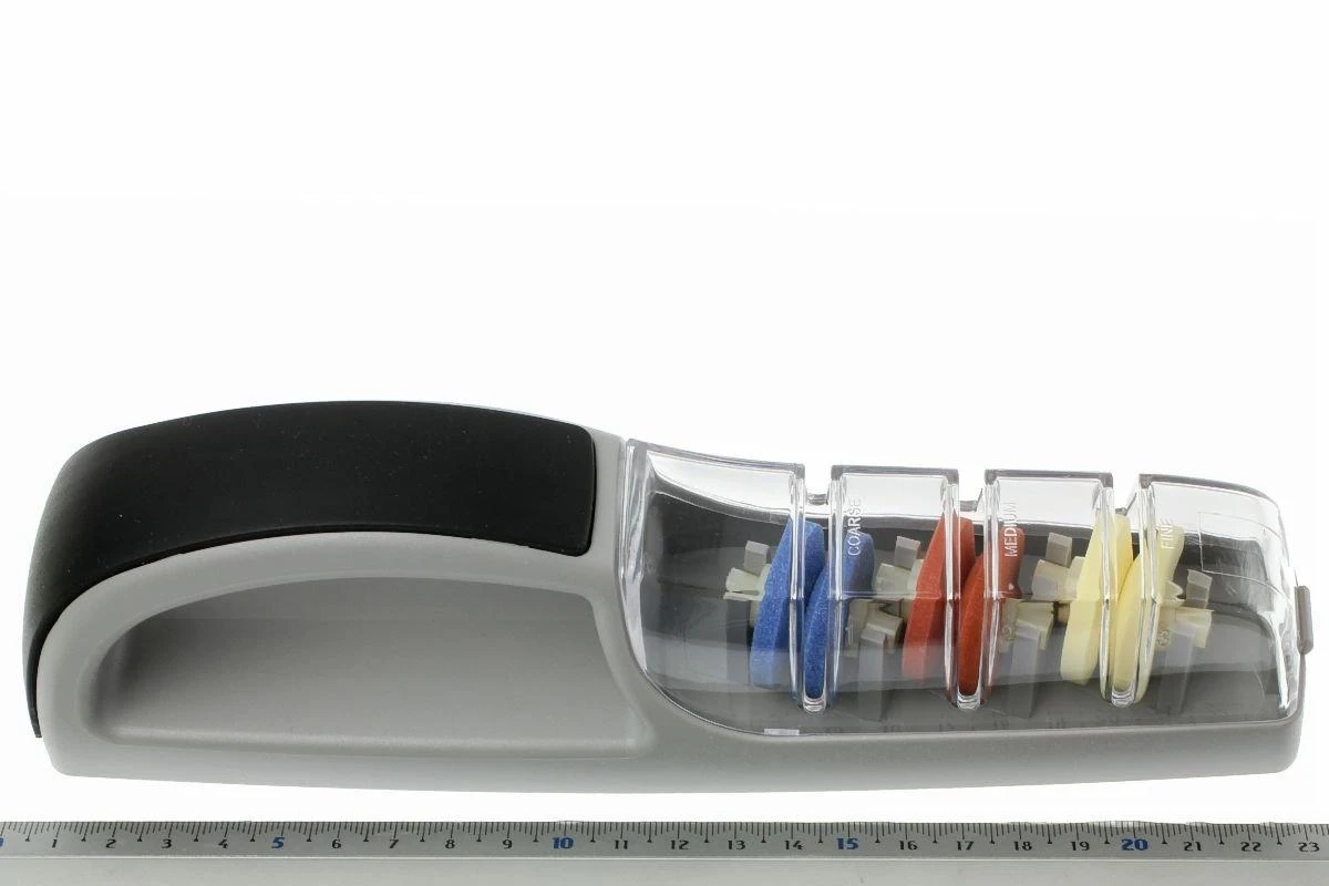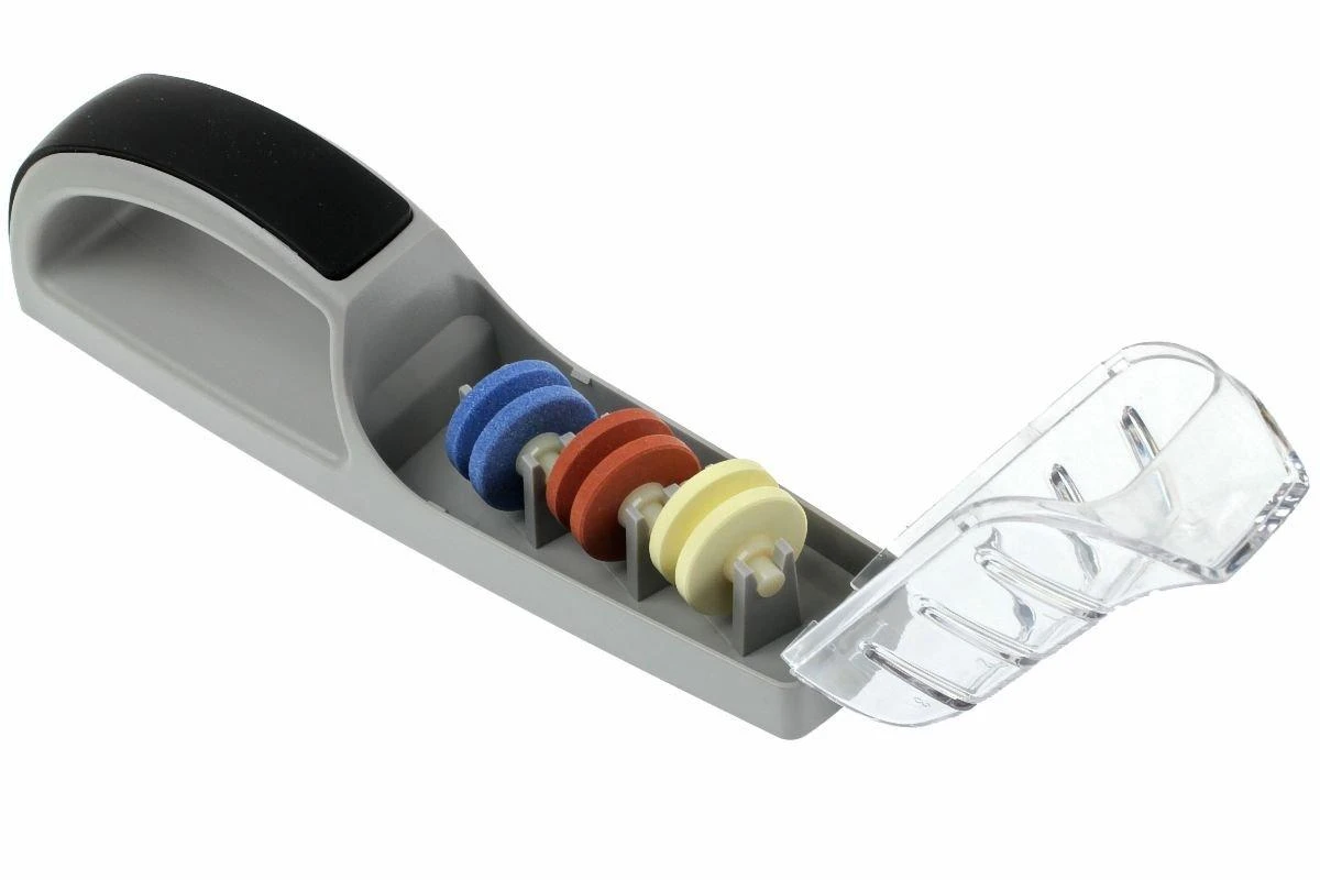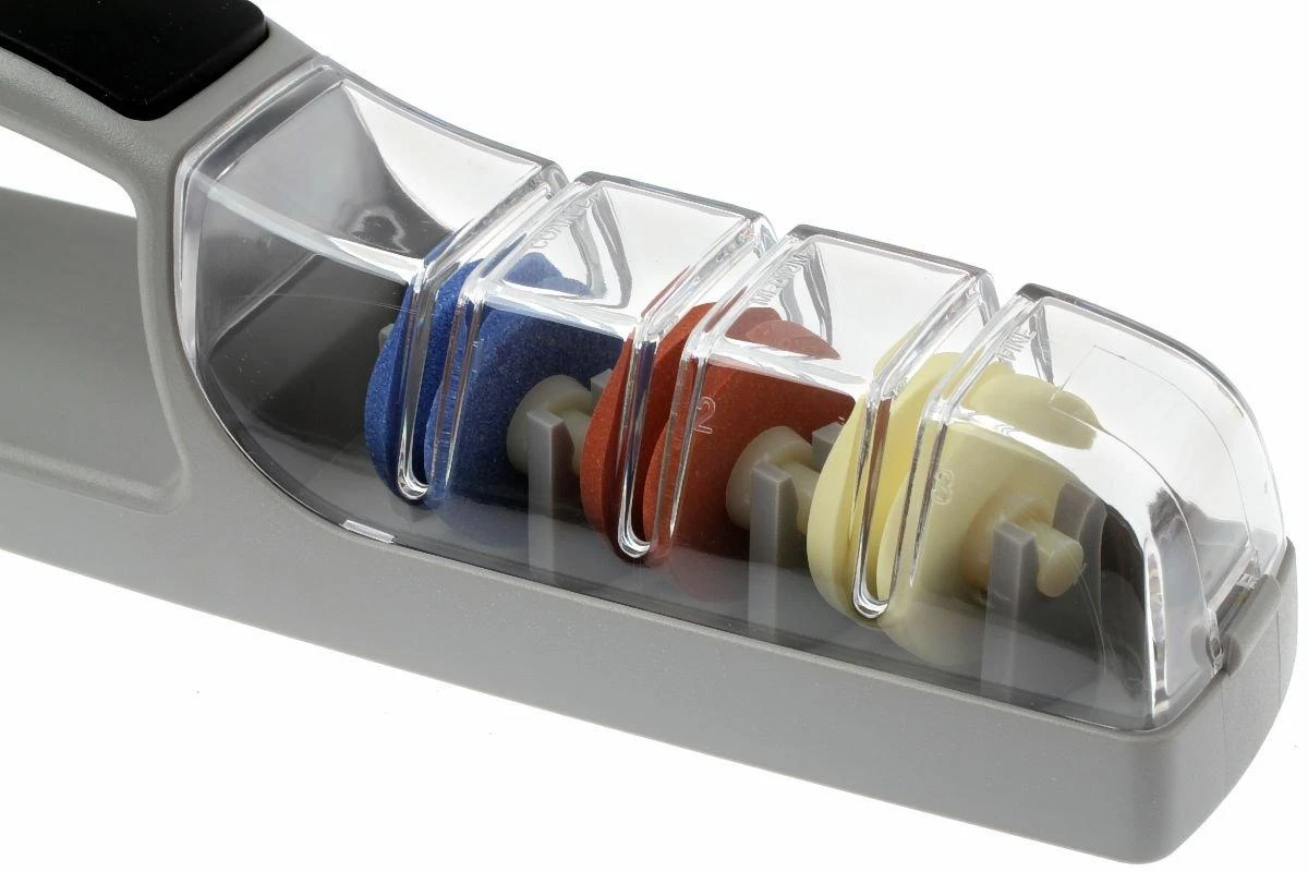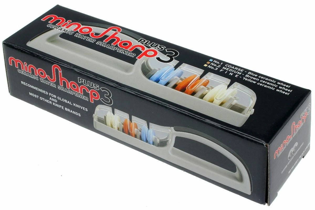 Avec l’aiguiseur à eau Minosharp 550BR Plus 3 il est très facile de rendre et garder les couteaux tranchants. On commence par remplir le réservoir avec un peu d’eau. L’aiguiseur est constitué de trois roues en céramique. On commence avec la roue bleue dont le grain est le plus grossier puis on passe à la roue marron dont le grain est plus moyen. Et on termine sur la roue blanche au grain le plus fin. On passe la lame du couteau 15 à 20 fois sur les roues sans exercer trop de pression. Après l’avoir passée dans chaque fente elle sera à nouveau tranchante comme un rasoir ! Comme la fente et les roues sont positionnée suivant un angle précis on ne peut pas se tromper d’angle d’aiguisage. Cet aiguiseur à eau est tellement facile à utiliser qu’il n’y a plus aucune raison d’utiliser des couteaux émoussés.
