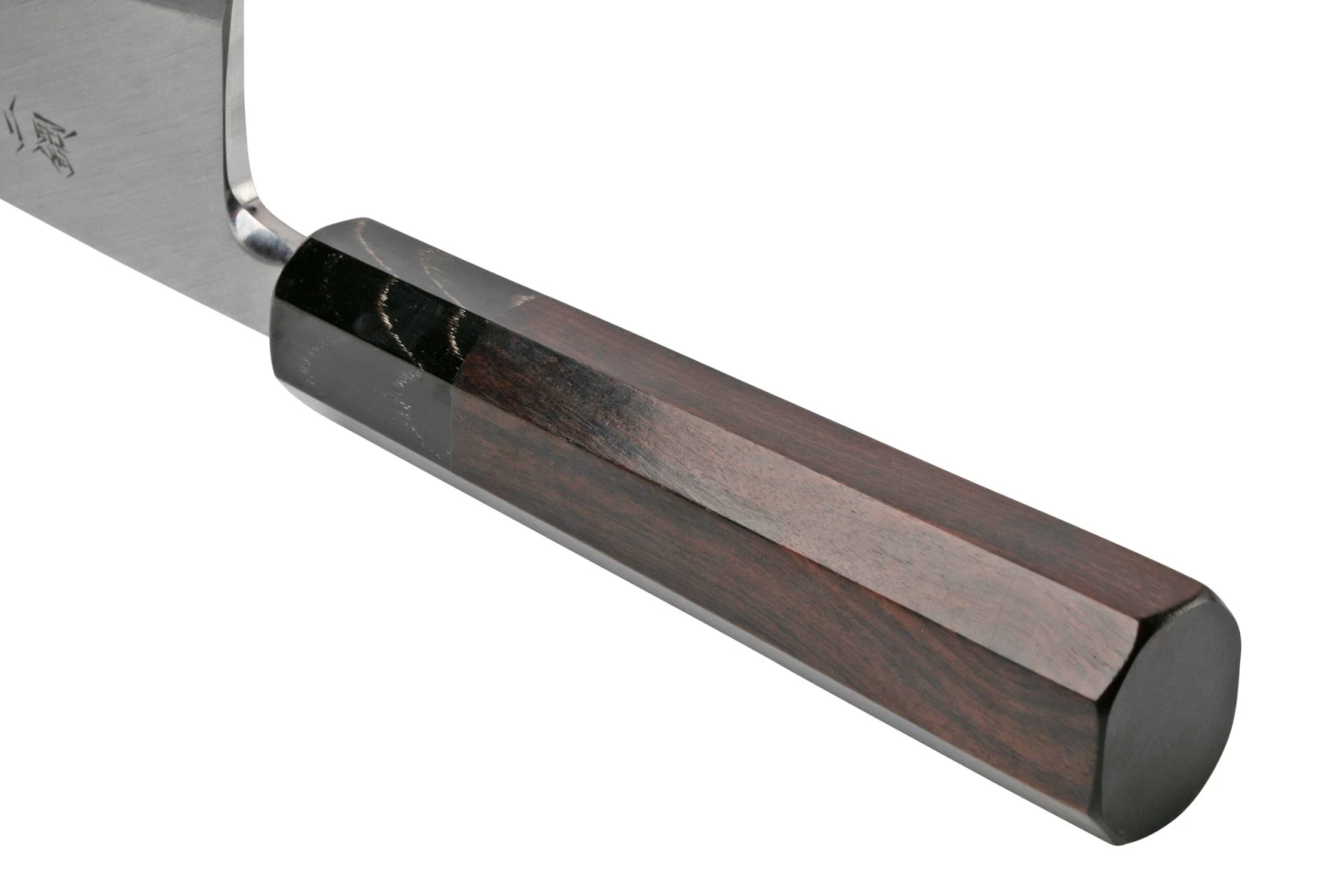 Le deba 18 cm Sakai Takayuki Blue 2 Steel Japanese Style 01237 est un couteau de cuisine japonais costaud ! Le deba est, à l’origine, conçu pour réaliser des filets de viande et de poisson. La lame est plus épaisse pour pouvoir appliquer plus de force, pour couper de petits os, des arêtes ou des tendons, sans l’abimer. Ce couteau n’est aiguisé que d’un côté, l’autre côté ayant une émouture creuse. Cela évite que la viande ou le poisson y reste collé pendant la coupe.