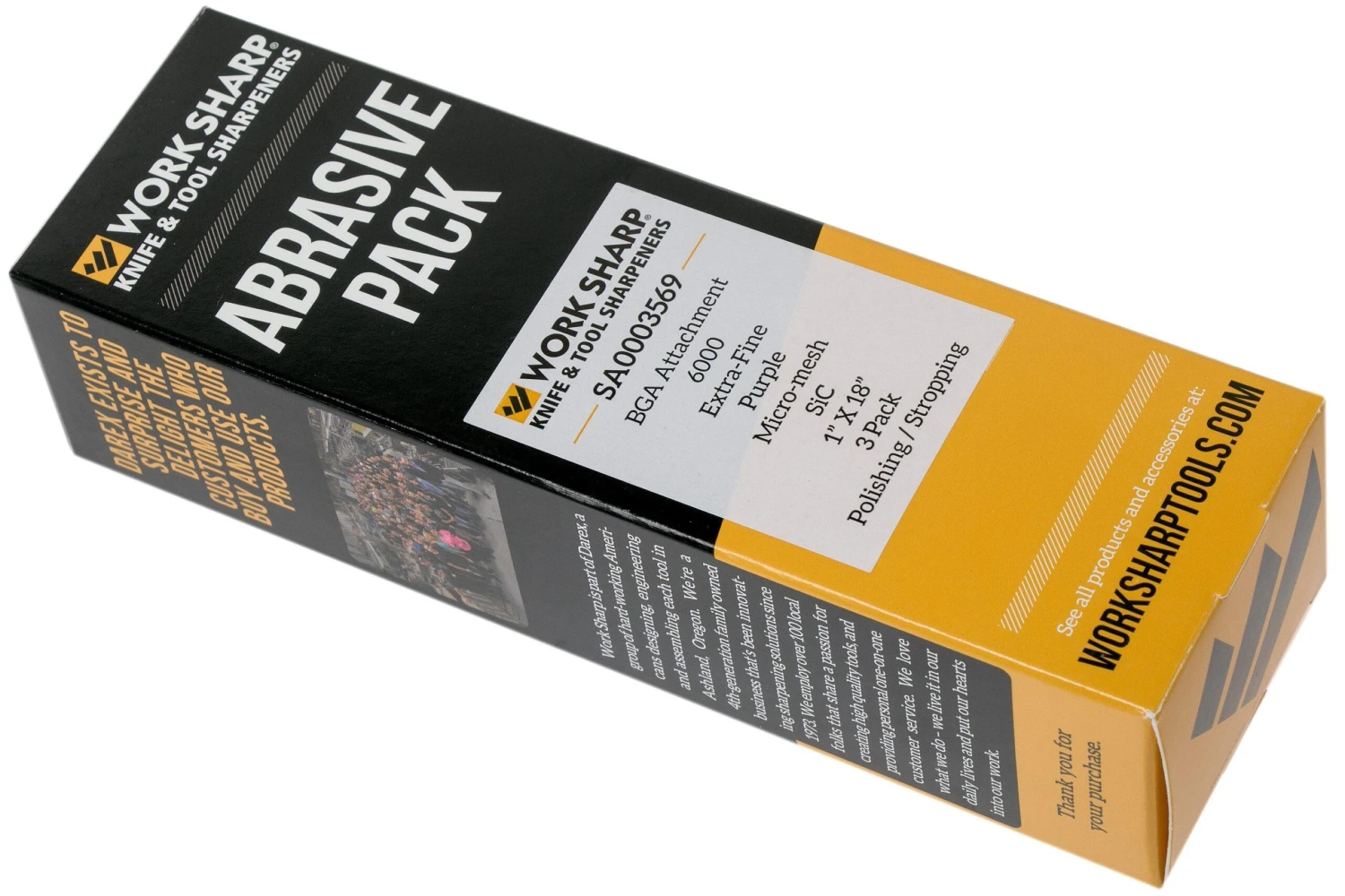 Le Set de bandes d’aiguisage,Work Sharp Blade Grinding Attachment, 6000 extra fine, SA0003569 est un set de trois bandes dâaiguisage ultra fines pour le Work Sharp Ken Onion Blade Grinding Attachment. Ces bandes dâaiguisage Ă la granulomĂ©trie 6000 sont parfaitement adaptĂ©es pour polir ou affiler les couteaux dĂ©jĂ bien aiguisĂ©s. Qui veux aiguiser les couteaux Ă©moussĂ©s, choisira les bandes dâaiguisage plus grossiĂšres.