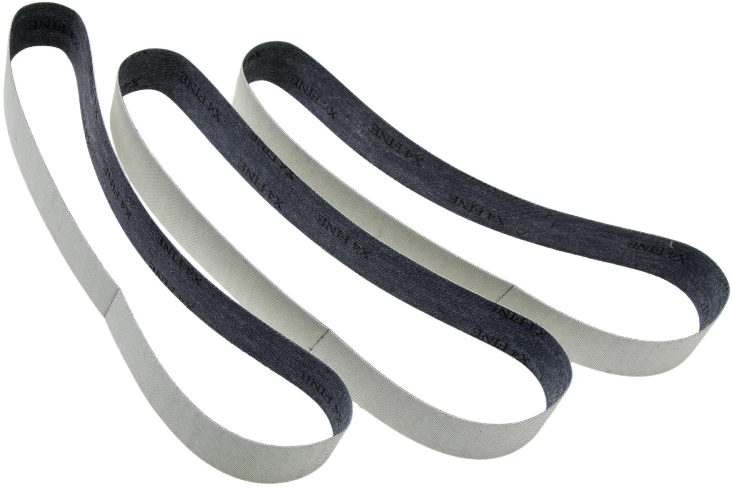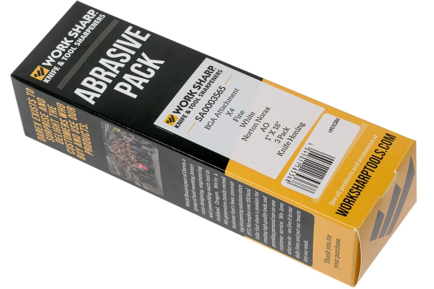 Le Set de bandes d’aiguisage,Work Sharp Blade Grinding Attachment, X4 fine, SA0003565 est un set de trois bandes d’aiguisage fines pour le Work Sharp Ken Onion Blade Grinding Attachment. Ces bandes d’aiguisage robustes à la granulométrie fine sont parfaitement adaptées pour perfectionner ou maintenir le tranchant des couteaux déjà aiguisés. Qui veux aiguiser les couteaux émoussés, choisira les bandes d’aiguisage plus grossières. Ces bandes d’aiguisage correspondent à une granulométrie de J3000 grit des pierres à aiguiser japonaises.