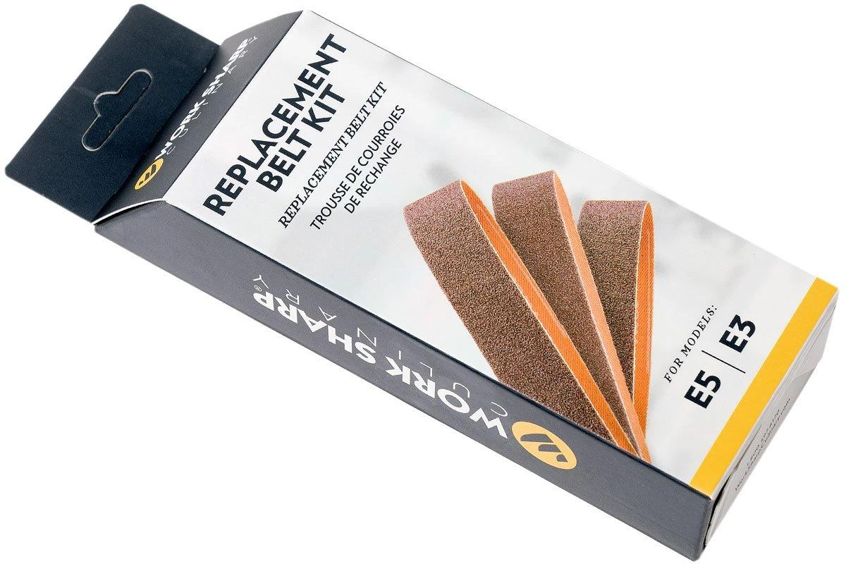 Ce Work Sharp Replacement Belt Kit Culinary E5 & E3 est un set de trois bandes d’aiguisage pour le Work Sharp Culinary. Celles-ci sont prévues pour être utilisées sur le Work Sharp Culinary E3 et le Work Sharp Culinary E5. Leur granulométrie est grossière.